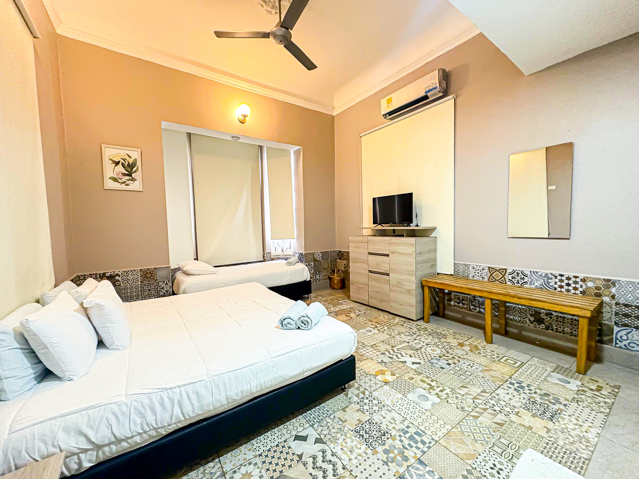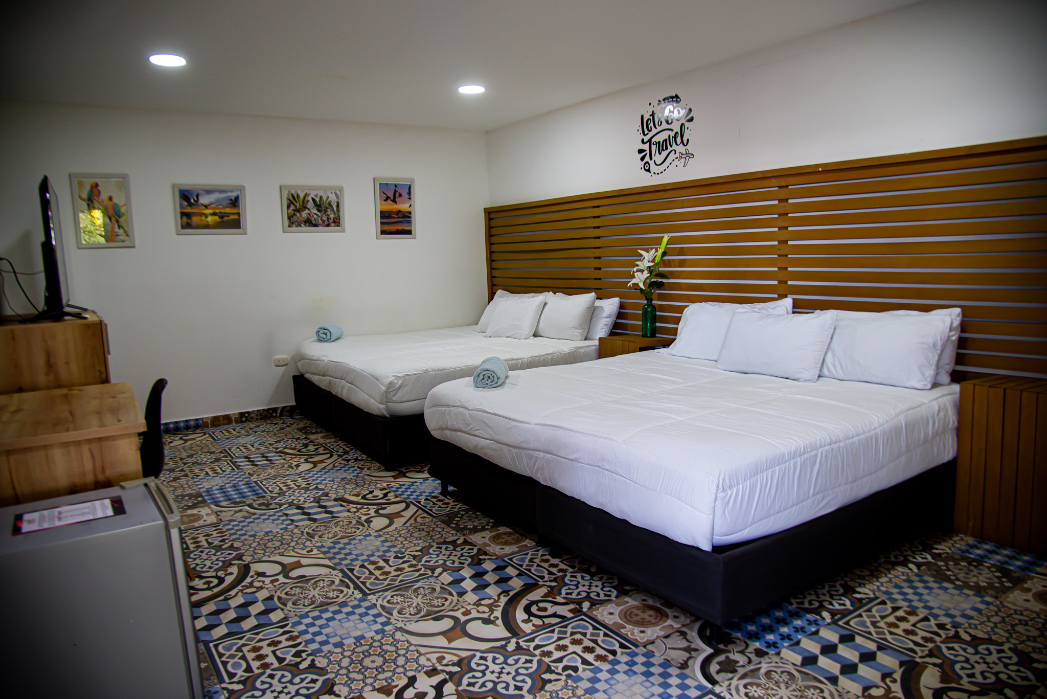 Perfecta para 3 personas. Incluye 1 cama King y 1 cama sencilla, aire acondicionado 24 h, ventilador, TV, tocador, espejo, luz de lectura, baño interno con ducha, toallas, acceso con llave magnética y puntos de energía.
